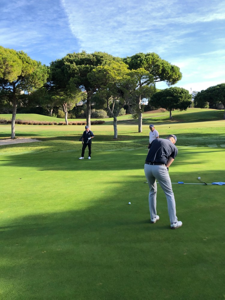 Vi spelar 5–9 hål, filmar svingen för att se skillnader i ”träningssvingen” och ”spelsvingen”. Under rundan diskuterar vi spelstrategi och val av slag. Vi avrundar lektionen efter rundan med eventuell teknisk feedback och information om hur man ska fortsätta son träning för att nå önskat resultat.